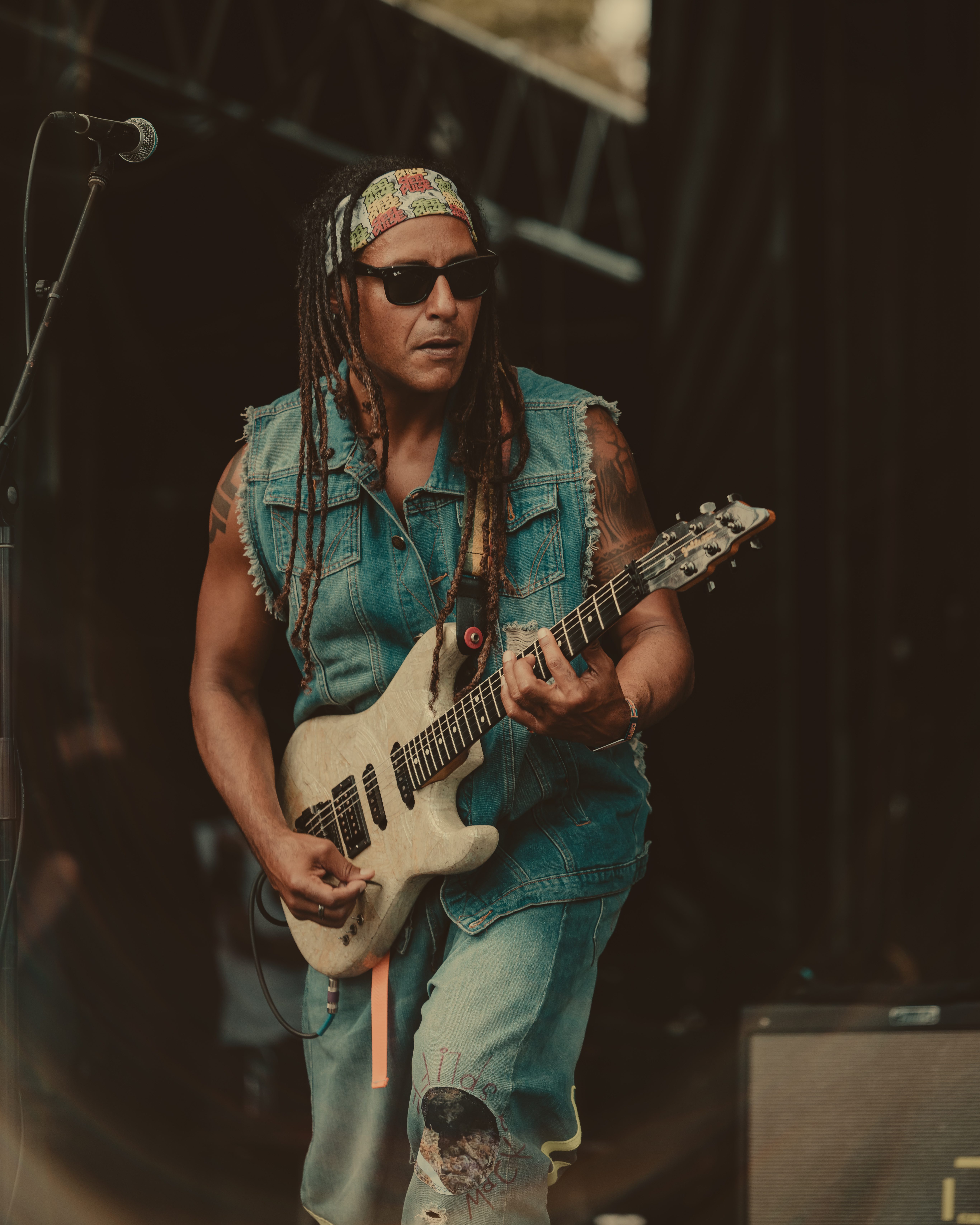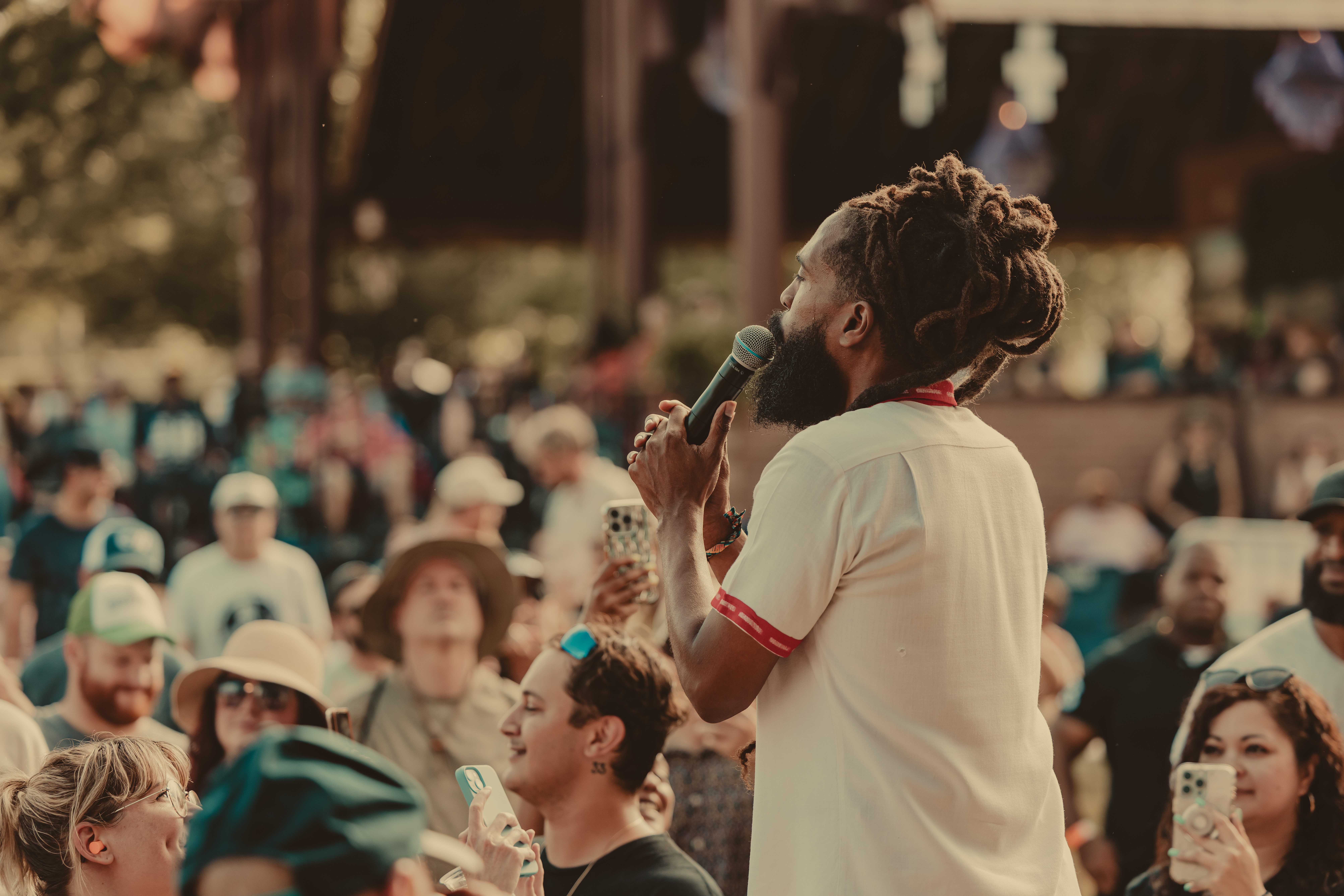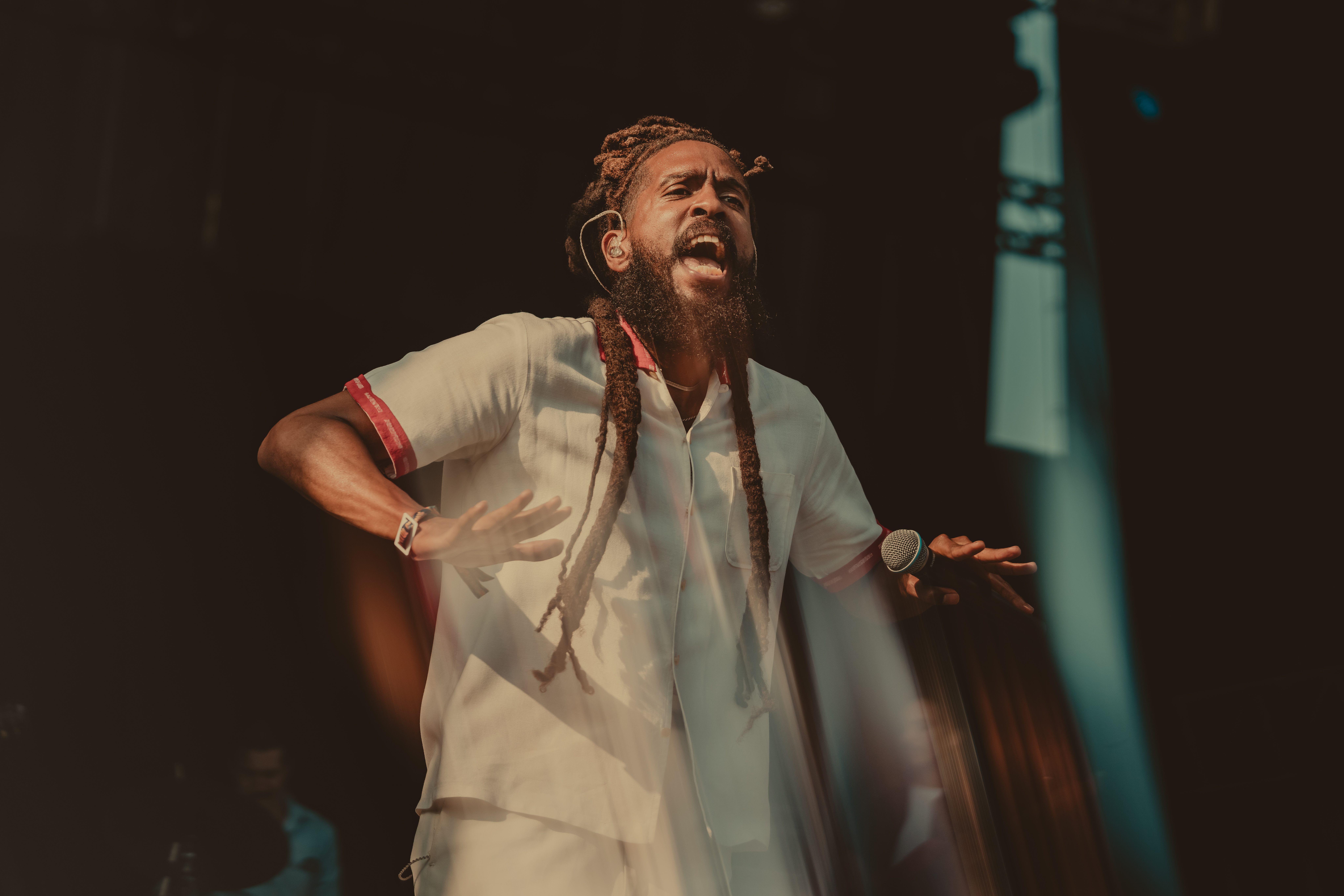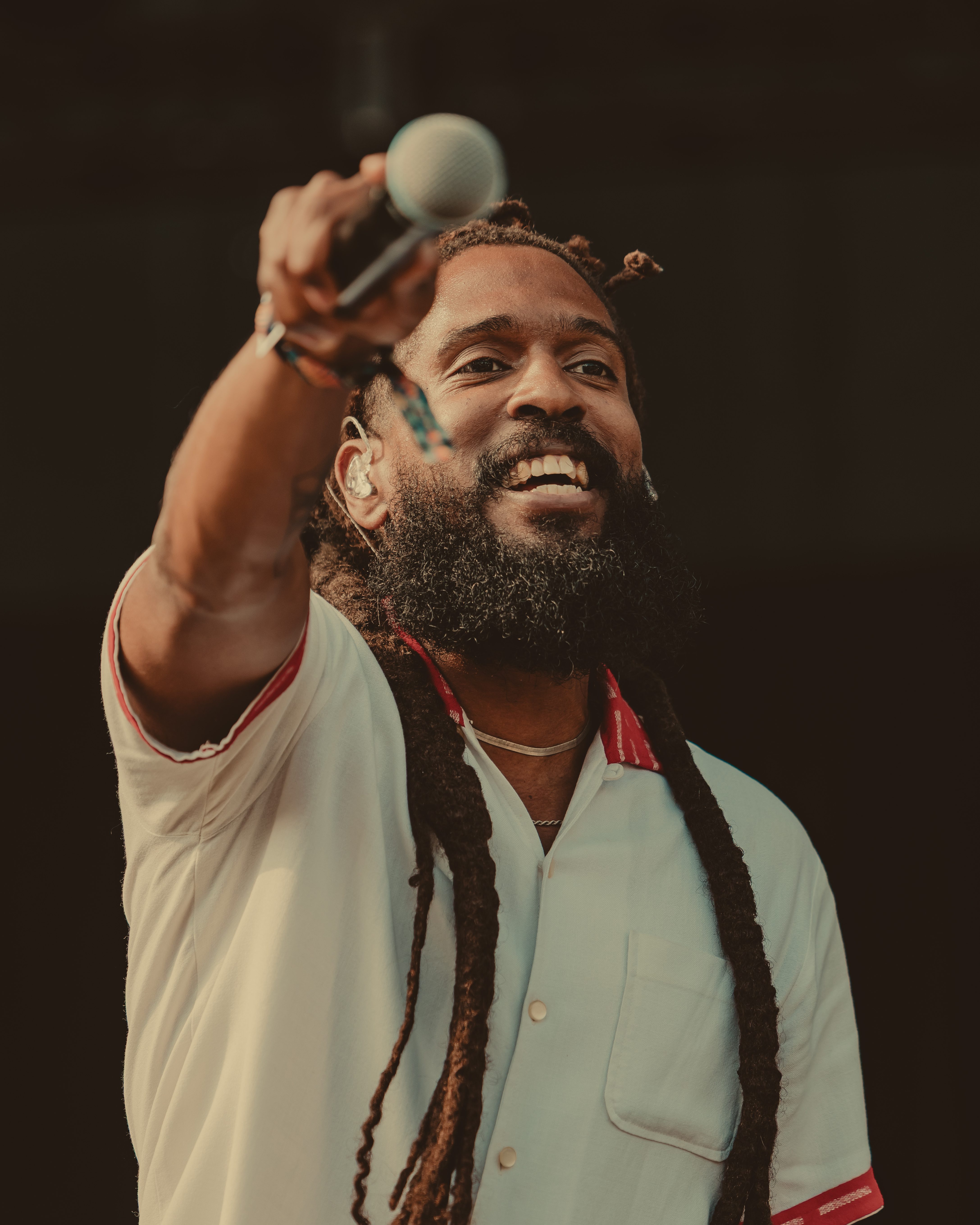 Thee Sacred Souls followed with a soulful set that connected deeply with the audience. The lead singer jumped off the stage to sing at the barrier, then by the end of the set, he surprised everyone by dashing into the lawn area, dropping into an empty camping chair as if to rest. With a playful head fake, he sprang back up and continued sprinting the length of the lawn. Fans swarmed around but stayed respectful, eager to soak up every bit of the frontman’s energy.