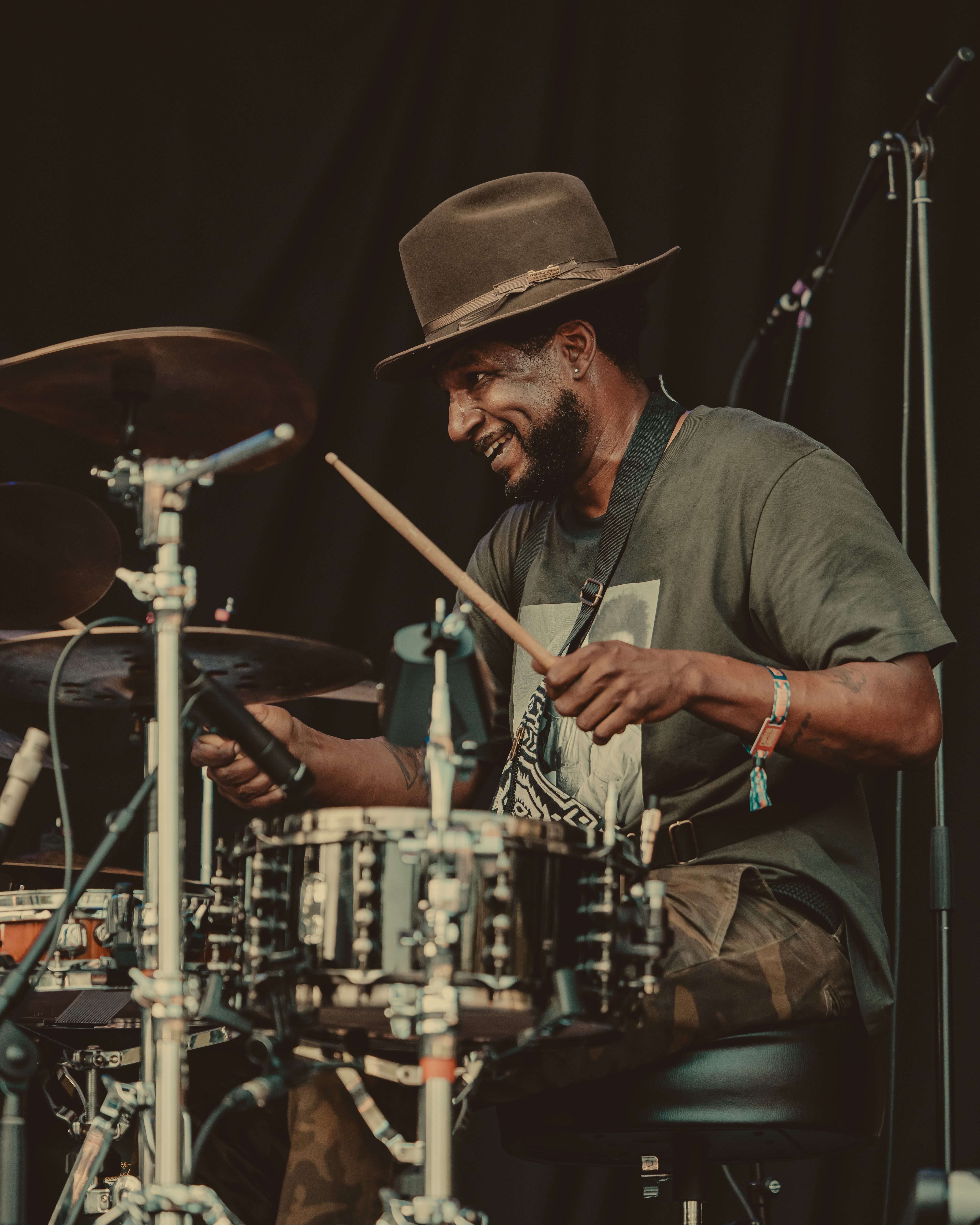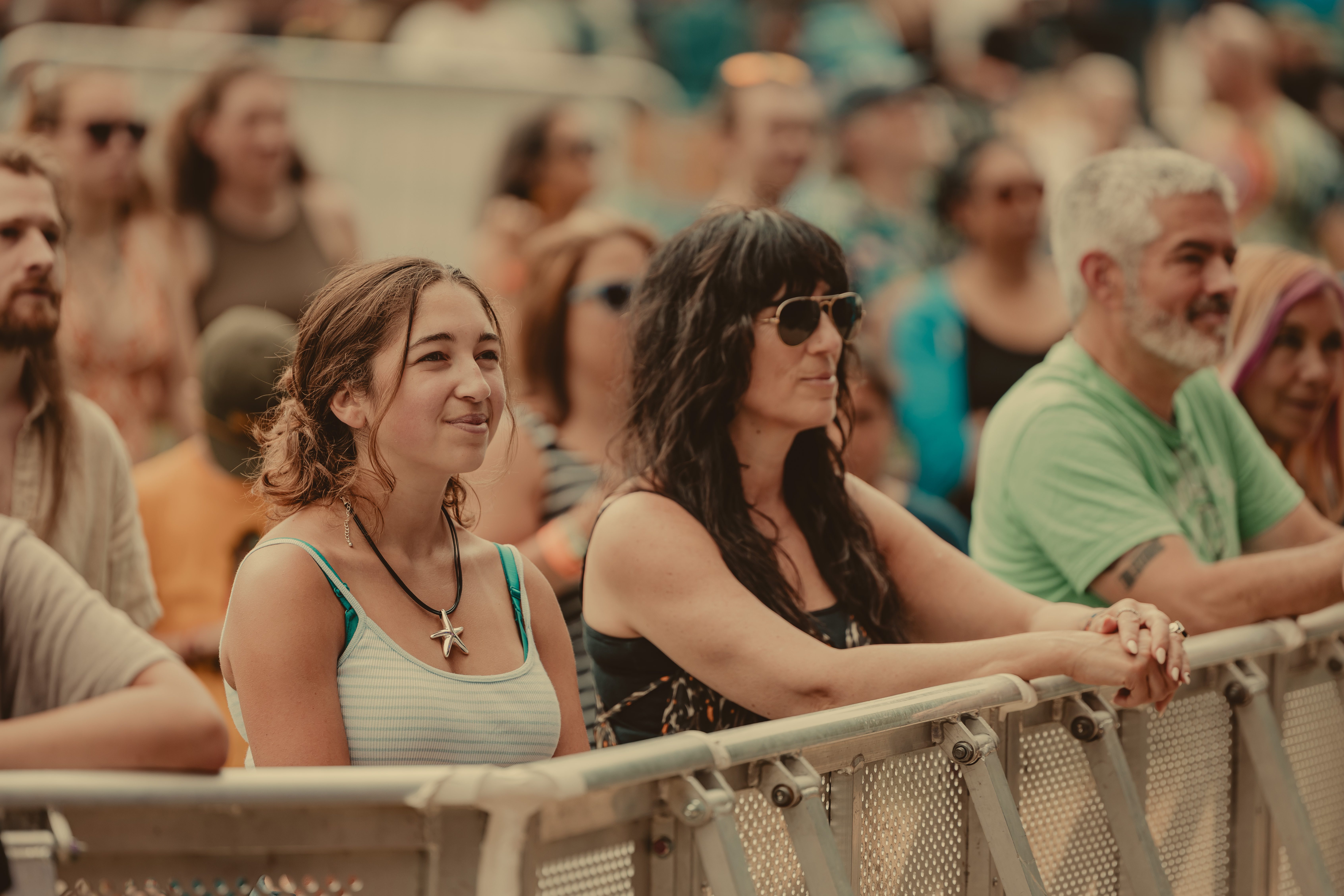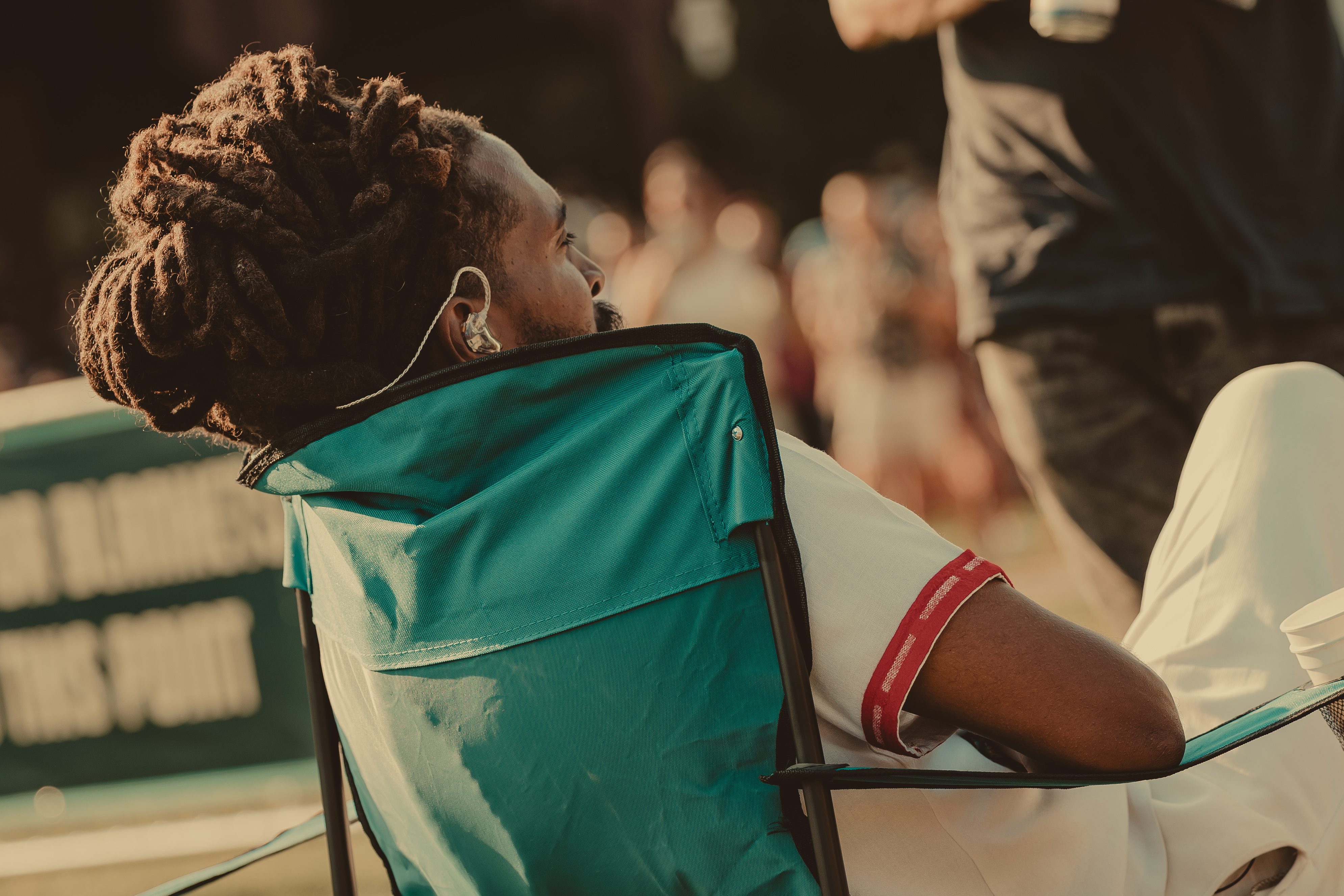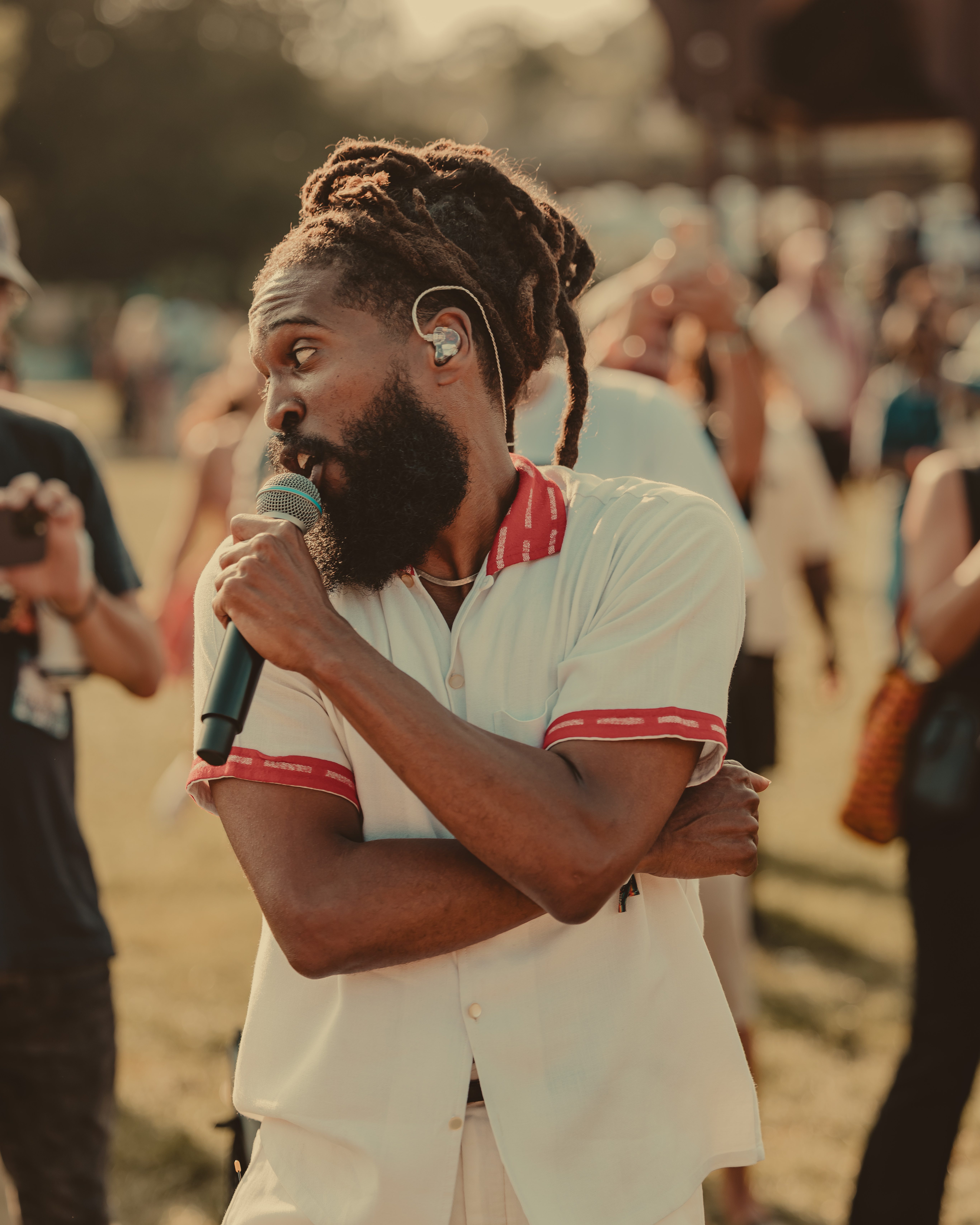 Thee Sacred Souls followed with a soulful set that connected deeply with the audience. The lead singer jumped off the stage to sing at the barrier, then by the end of the set, he surprised everyone by dashing into the lawn area, dropping into an empty camping chair as if to rest. With a playful head fake, he sprang back up and continued sprinting the length of the lawn. Fans swarmed around but stayed respectful, eager to soak up every bit of the frontman’s energy.